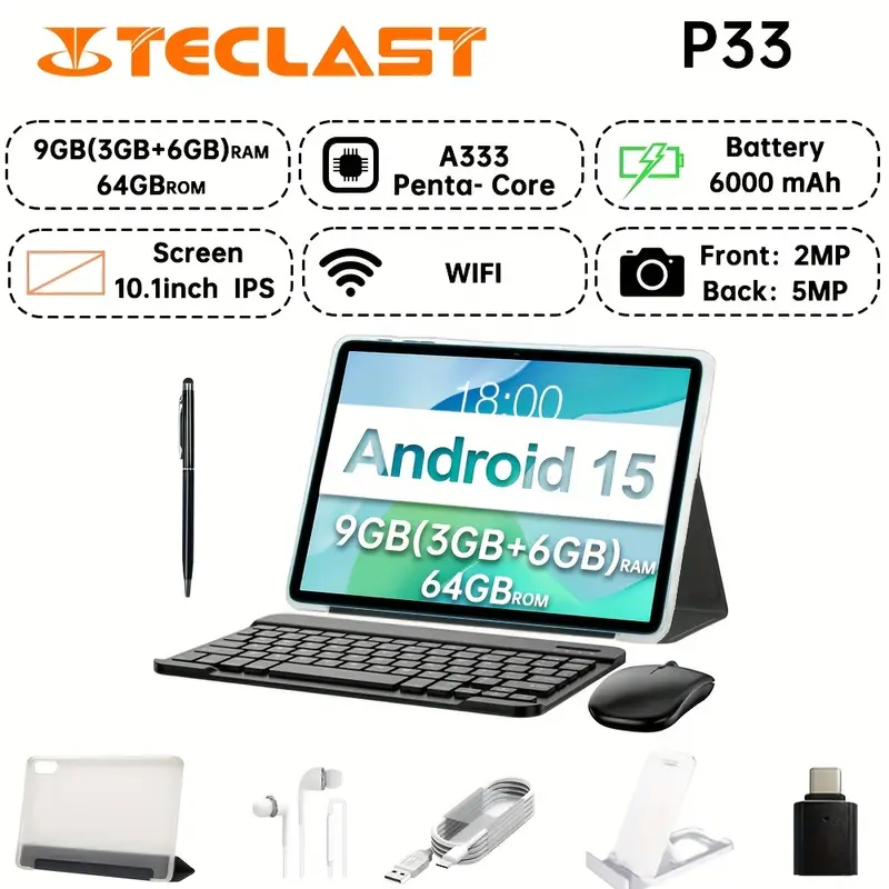 Teclast P33 Nouvelle Tablette, Android 15, 10,1 pouces IPS, 1280x800 Résolution, Processeur Quad-Core Allwinner A333, 9 Go + 6 Go de Stockage Virtuel Extensible (64 Go), WIFI, Charge Type-C à 6000 mAh, Caméras Dual HD 5 MP Arrière et 2 MP Avant, Pack Complet avec Clavier & Souris sans Fil, Tablette Multimédia,Appareil Portable,Tablette Compacte,Construction Durable,Performance Fiable,Tablette avec Écran IPS,Tablette Professionnelle,Passionnés de Technologie